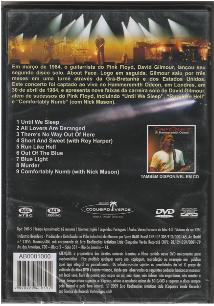 David Gilmour at Hammersmith Odeon 1964 - DVD Rock brings you an amazing show by the lead singer of the legendary rock band Pink Floyd during his solo career, David Gilmour live in high definition audio and video for you to watch whenever you want! Hear some of Pink Floyd's biggest hits as well as the singer's new singles in this spectacular show that no Pink Floyd and David Gilmour fan can miss!